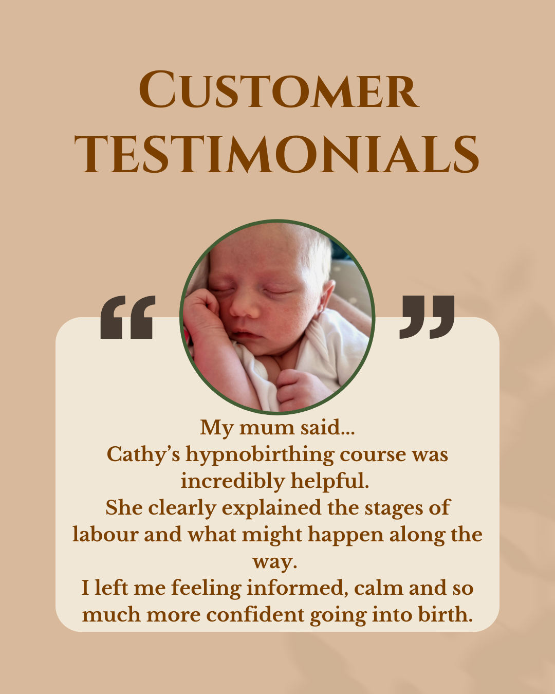 You will receive, teaching from a qualified midwife/hypnobirth instructor, a hypnobirthing manual, learning in a supportive environment, whatsapp community group, phone support if needed up to/during birth.